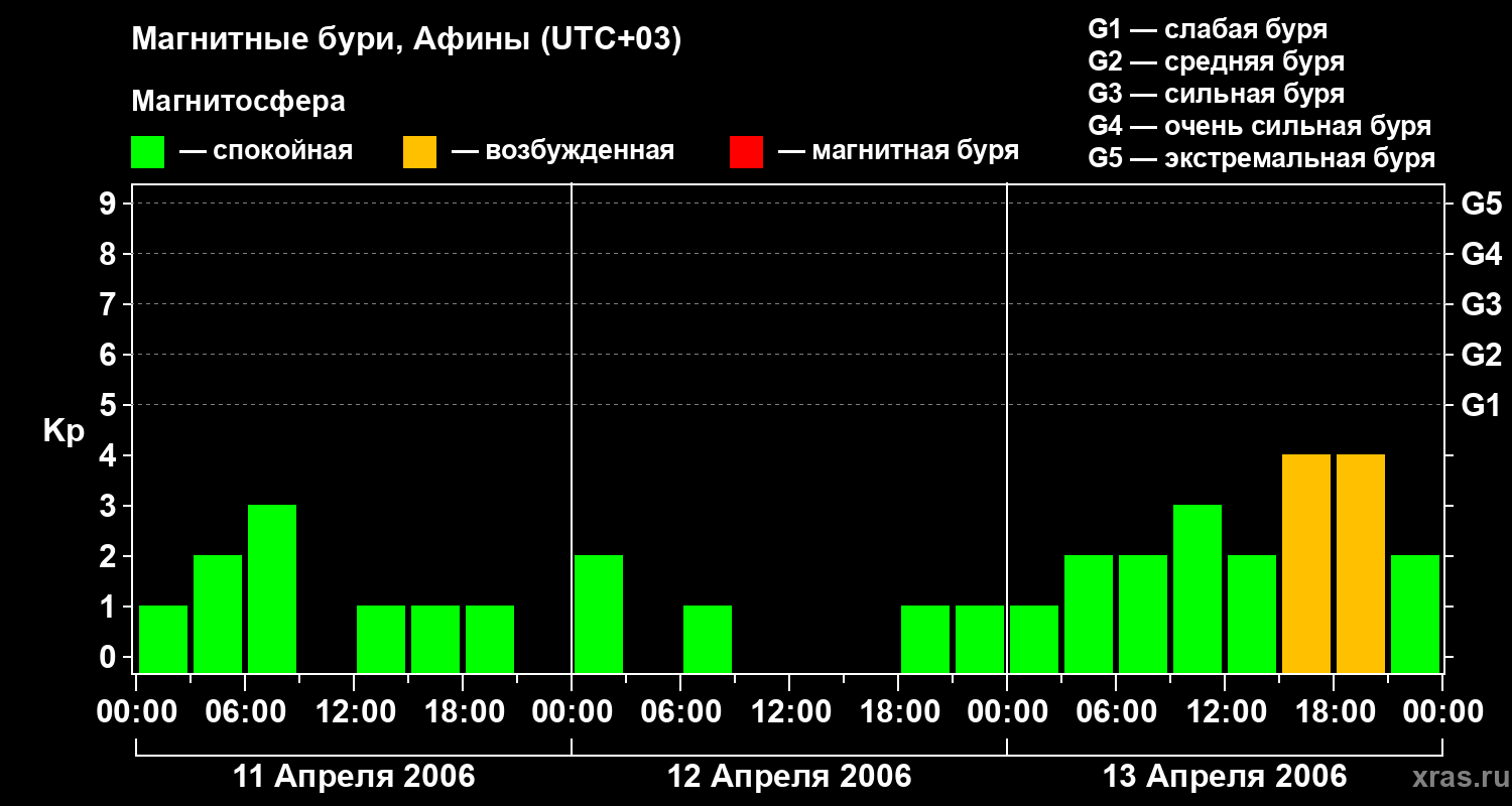Изменения геомагнитного индекса Kp с 11 по 13 апреля 2006 года для средних широт