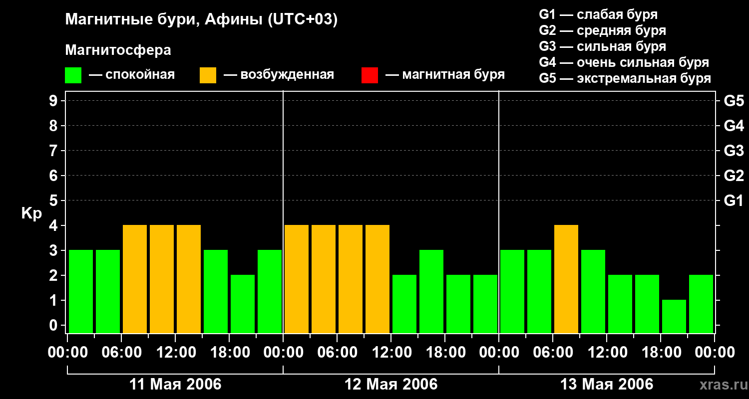 Изменения геомагнитного индекса Kp с 11 по 13 мая 2006 года для средних широт