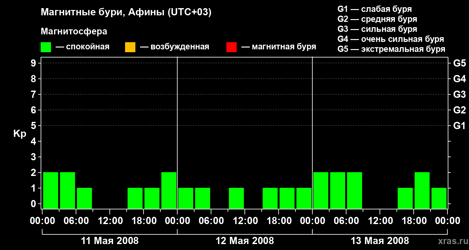 Изменения геомагнитного индекса Kp с 11 по 13 мая 2008 года для средних широт