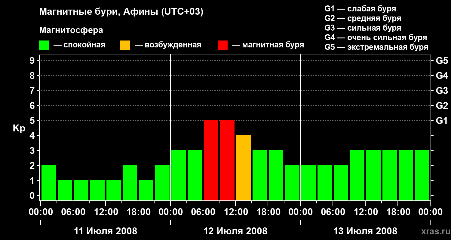 Изменения геомагнитного индекса Kp с 11 по 13 июля 2008 года для средних широт