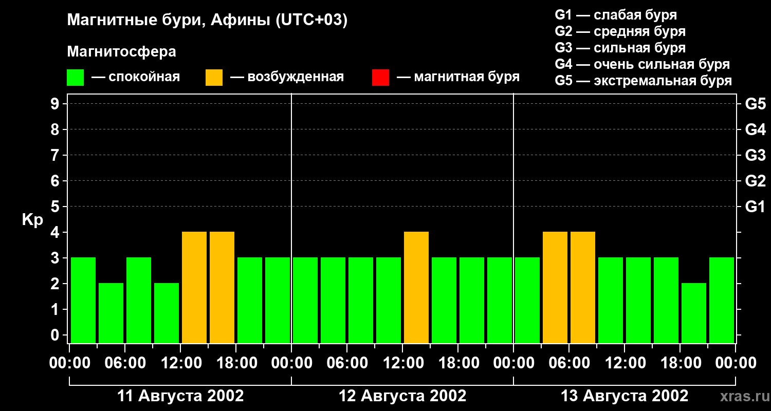 Изменения геомагнитного индекса Kp с 11 по 13 августа 2002 года для средних широт