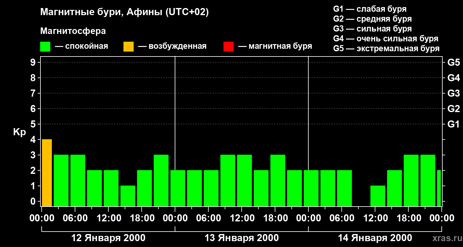 Изменения геомагнитного индекса Kp с 12 по 14 января 2000 года для средних широт