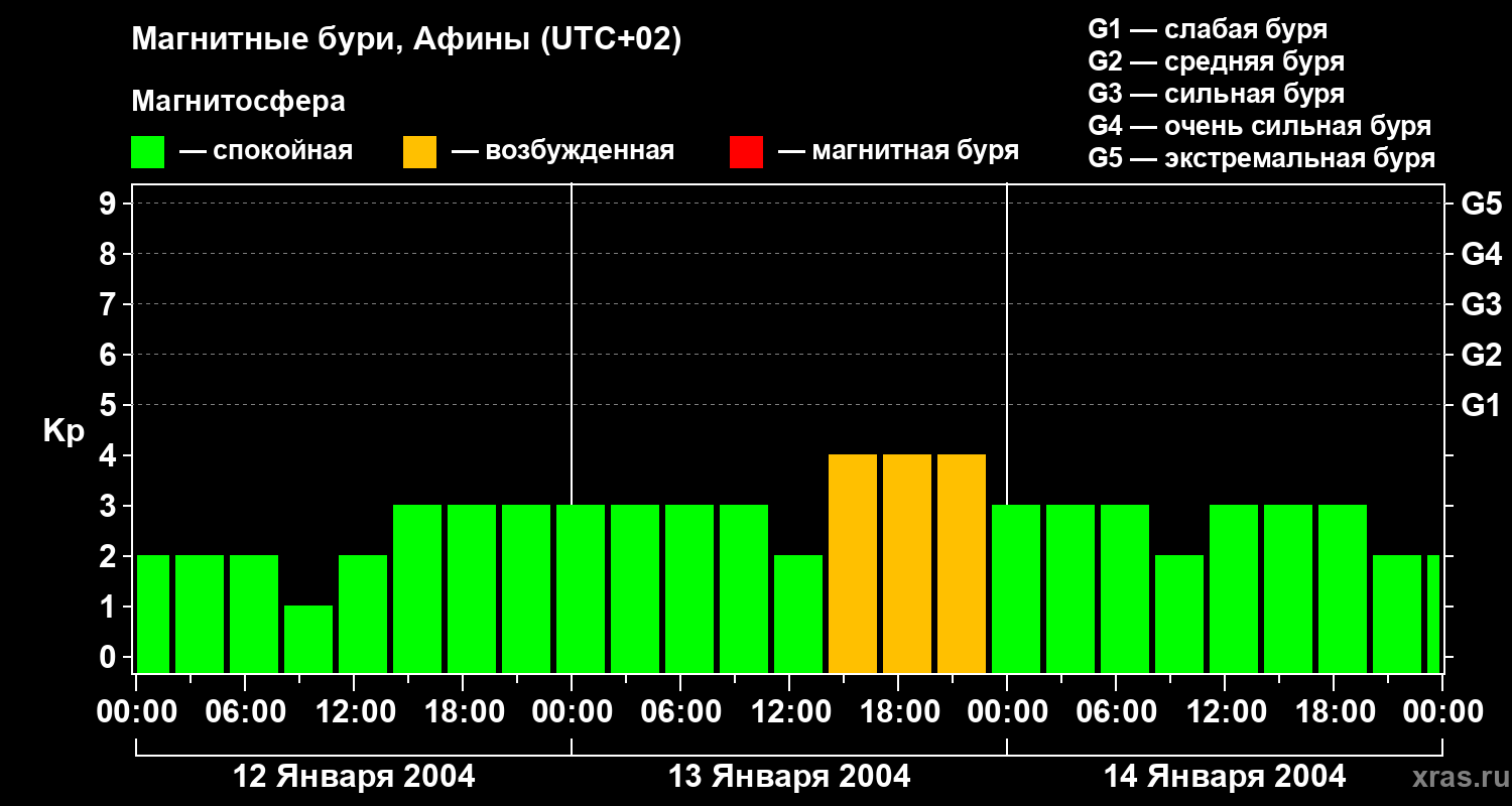 Изменения геомагнитного индекса Kp с 12 по 14 января 2004 года для средних широт