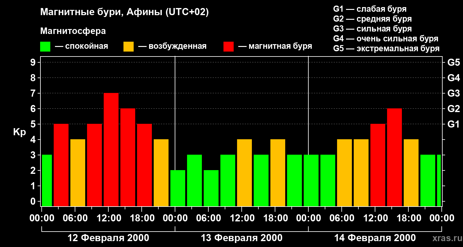 Изменения геомагнитного индекса Kp с 12 по 14 февраля 2000 года для средних широт
