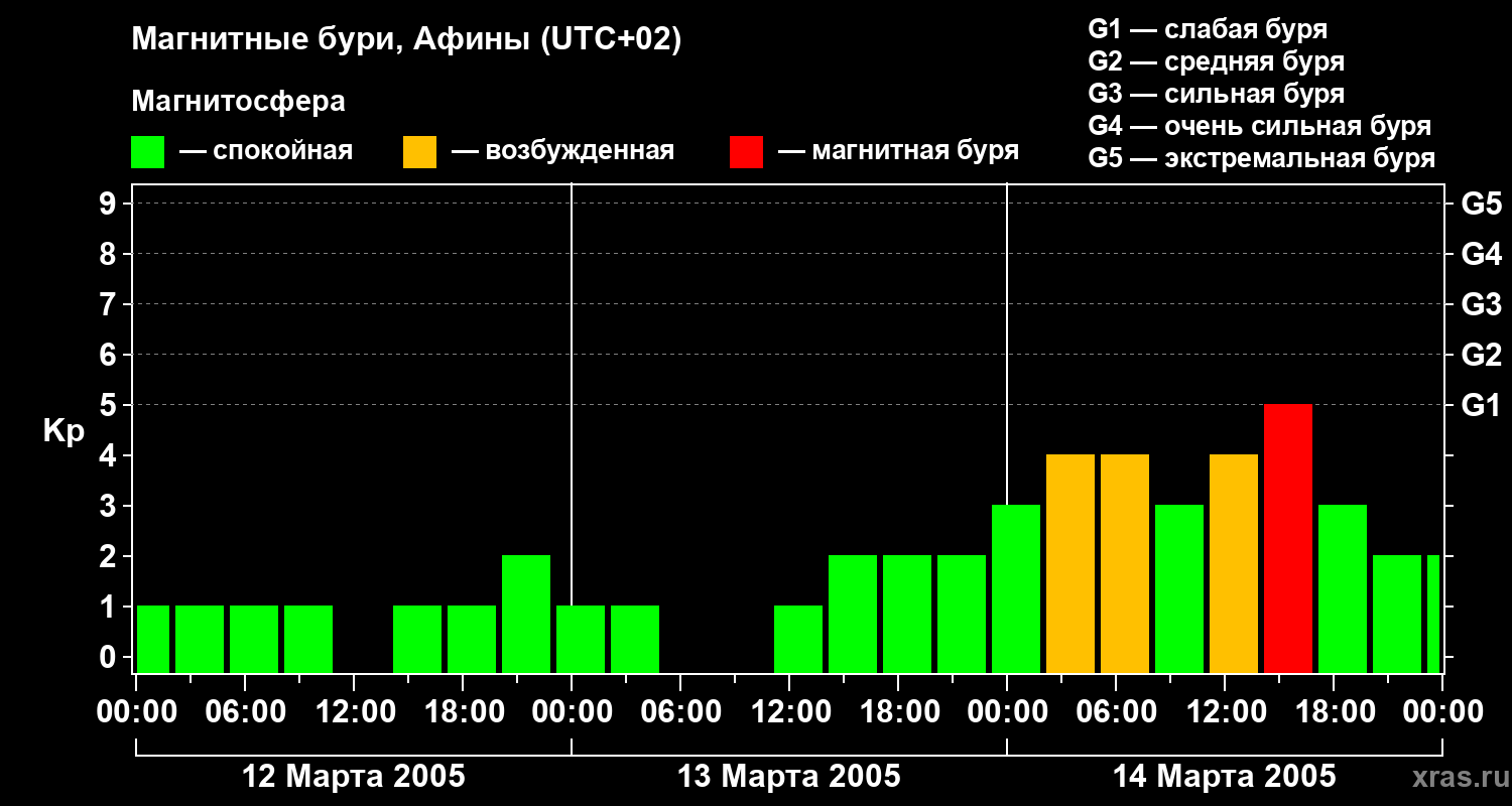Изменения геомагнитного индекса Kp с 12 по 14 марта 2005 года для средних широт