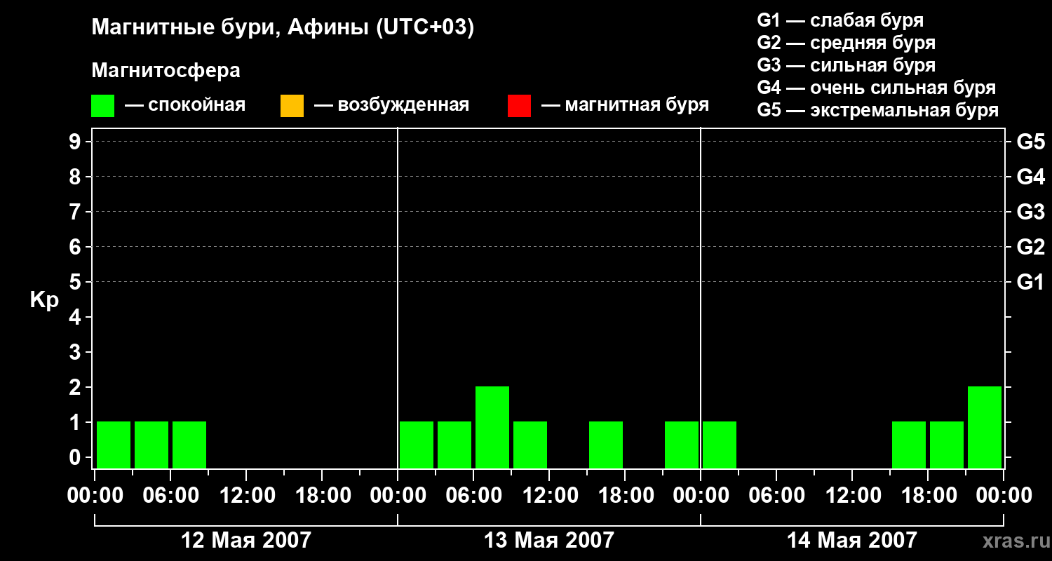 Изменения геомагнитного индекса Kp с 12 по 14 мая 2007 года для средних широт