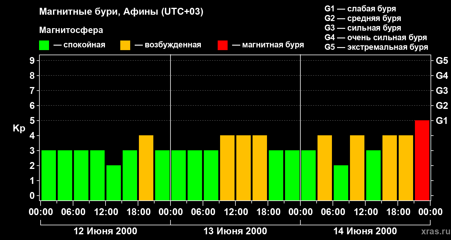 Изменения геомагнитного индекса Kp с 12 по 14 июня 2000 года для средних широт