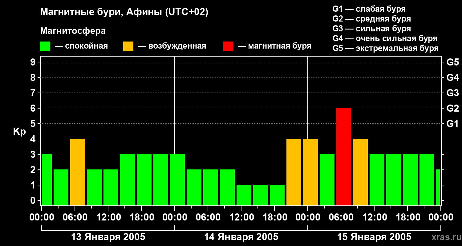 Изменения геомагнитного индекса Kp с 13 по 15 января 2005 года для средних широт