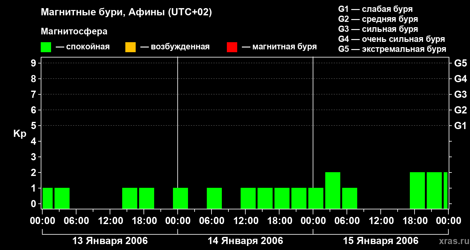 Изменения геомагнитного индекса Kp с 13 по 15 января 2006 года для средних широт