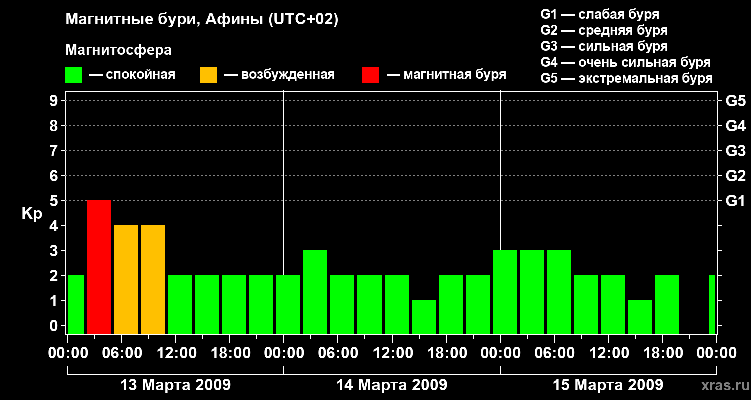 Изменения геомагнитного индекса Kp с 13 по 15 марта 2009 года для средних широт