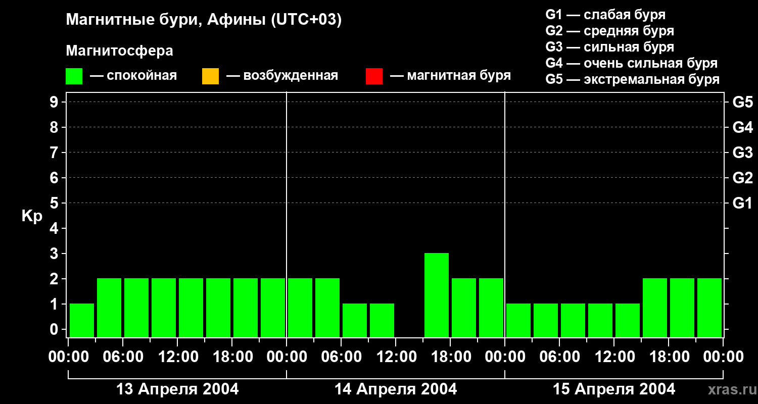 Изменения геомагнитного индекса Kp с 13 по 15 апреля 2004 года для средних широт