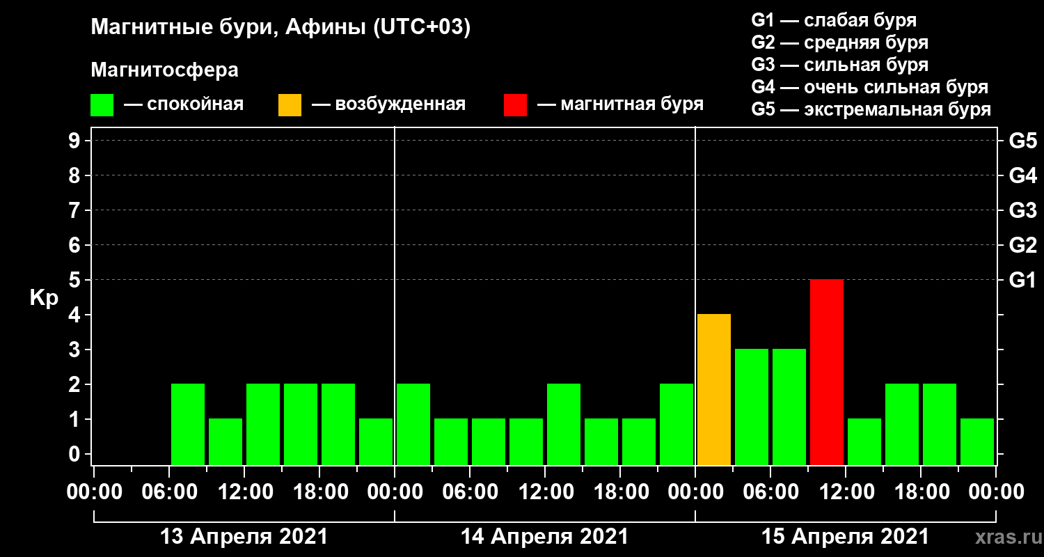 Изменения геомагнитного индекса Kp с 13 по 15 апреля 2021 года для средних широт