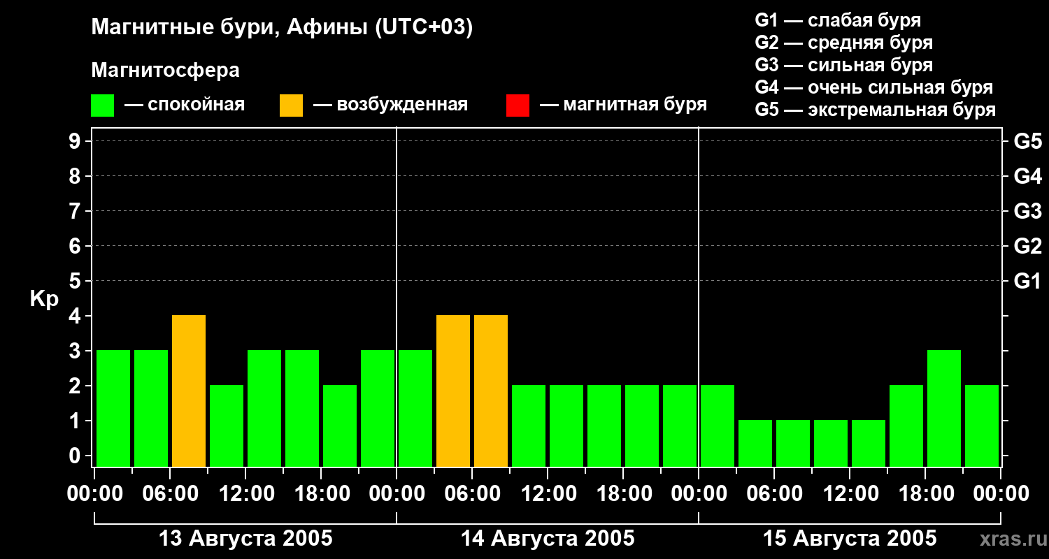 Изменения геомагнитного индекса Kp с 13 по 15 августа 2005 года для средних широт