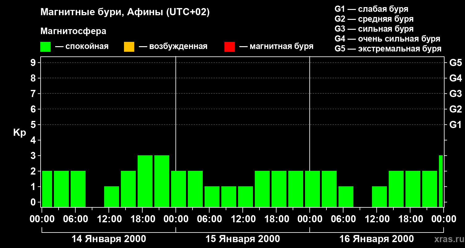 Изменения геомагнитного индекса Kp с 14 по 16 января 2000 года для средних широт