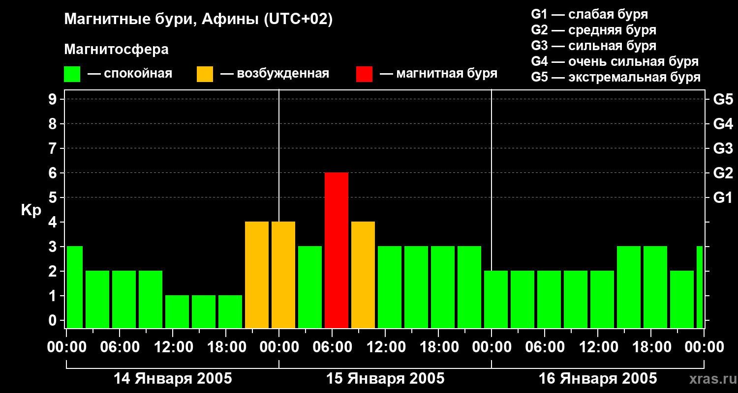 Изменения геомагнитного индекса Kp с 14 по 16 января 2005 года для средних широт