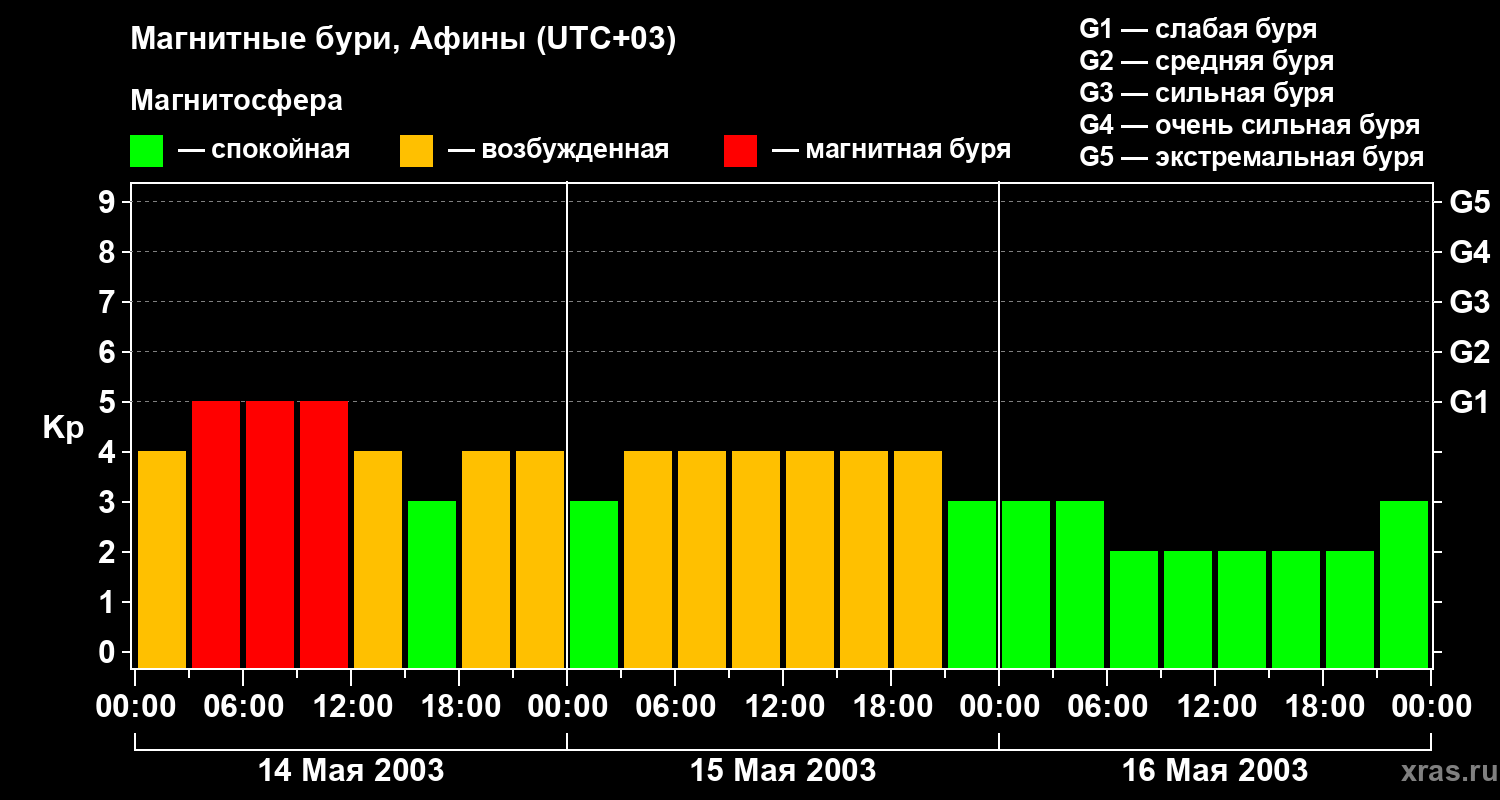 Изменения геомагнитного индекса Kp с 14 по 16 мая 2003 года для средних широт