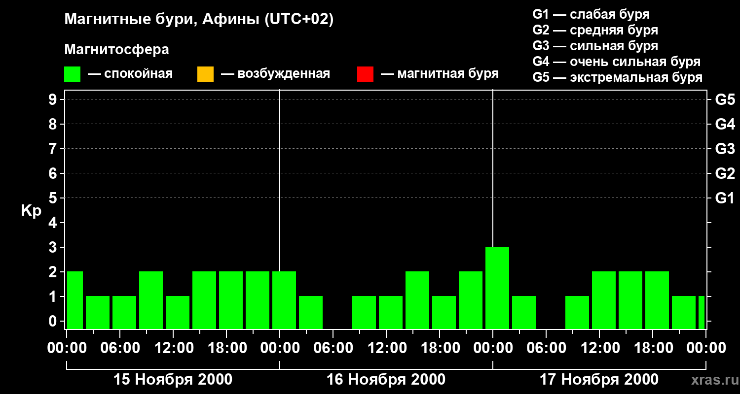 Изменения геомагнитного индекса Kp с 15 по 17 ноября 2000 года для средних широт