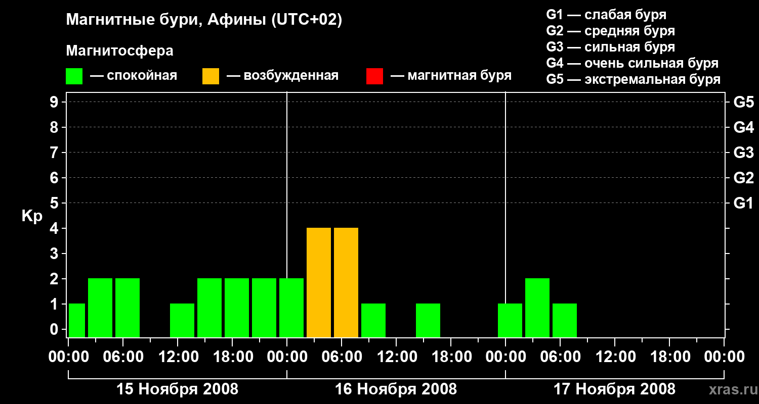 Изменения геомагнитного индекса Kp с 15 по 17 ноября 2008 года для средних широт