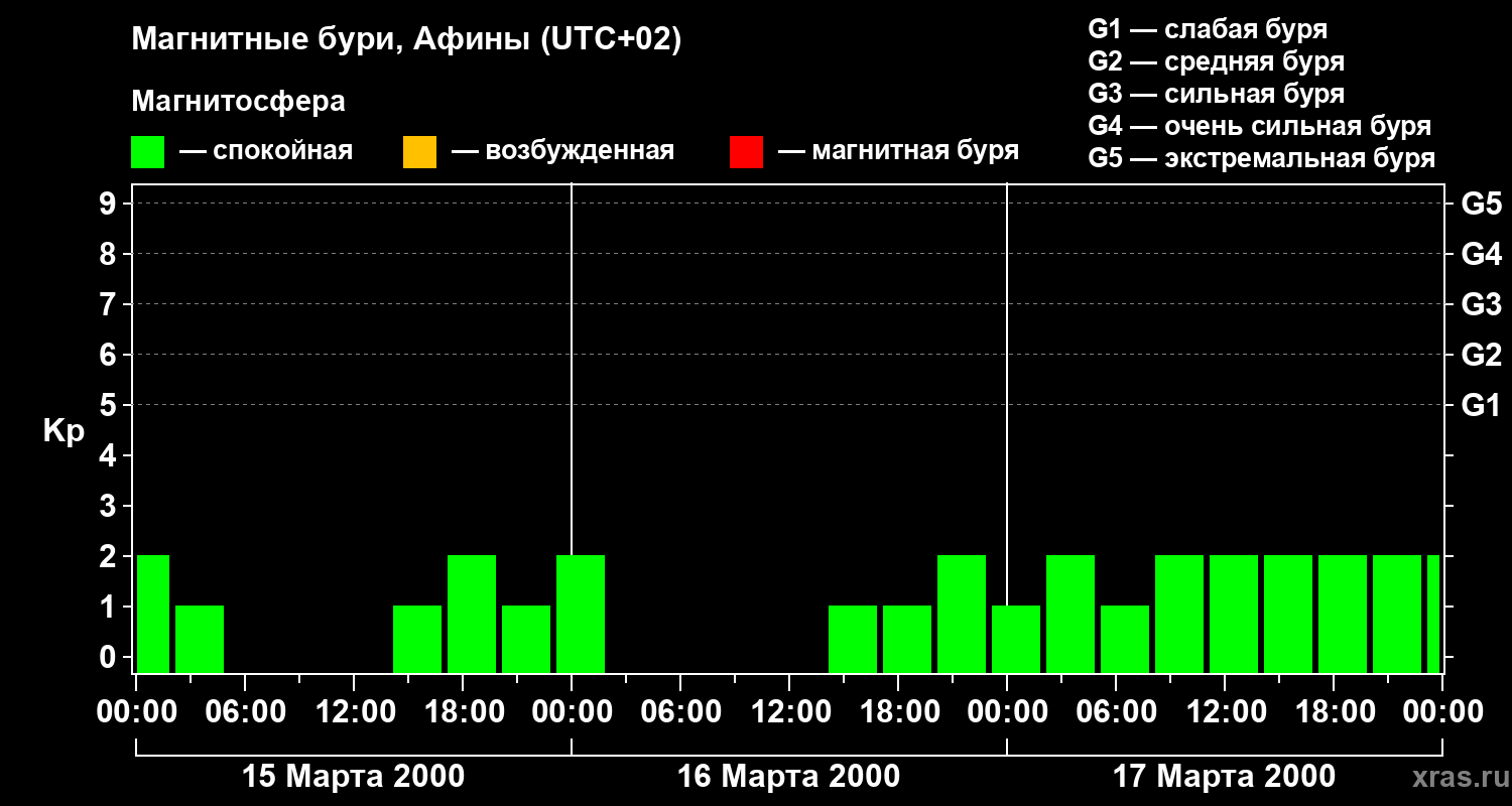 Изменения геомагнитного индекса Kp с 15 по 17 марта 2000 года для средних широт