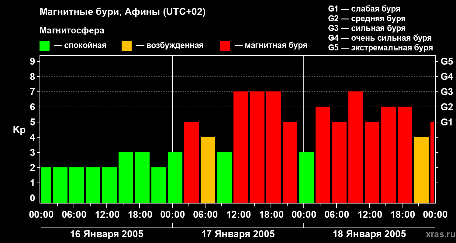 Изменения геомагнитного индекса Kp с 16 по 18 января 2005 года для средних широт