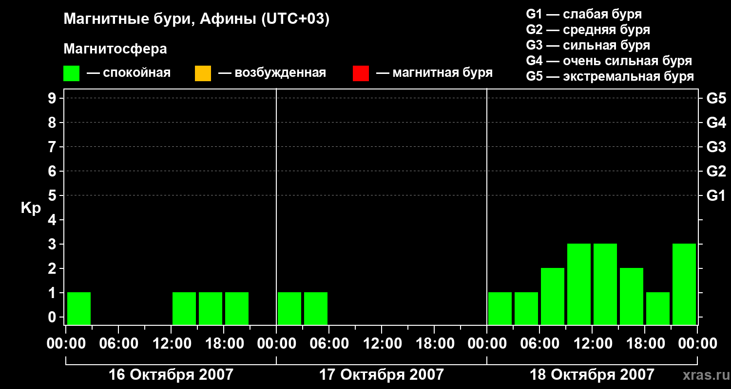 Изменения геомагнитного индекса Kp с 16 по 18 октября 2007 года для средних широт