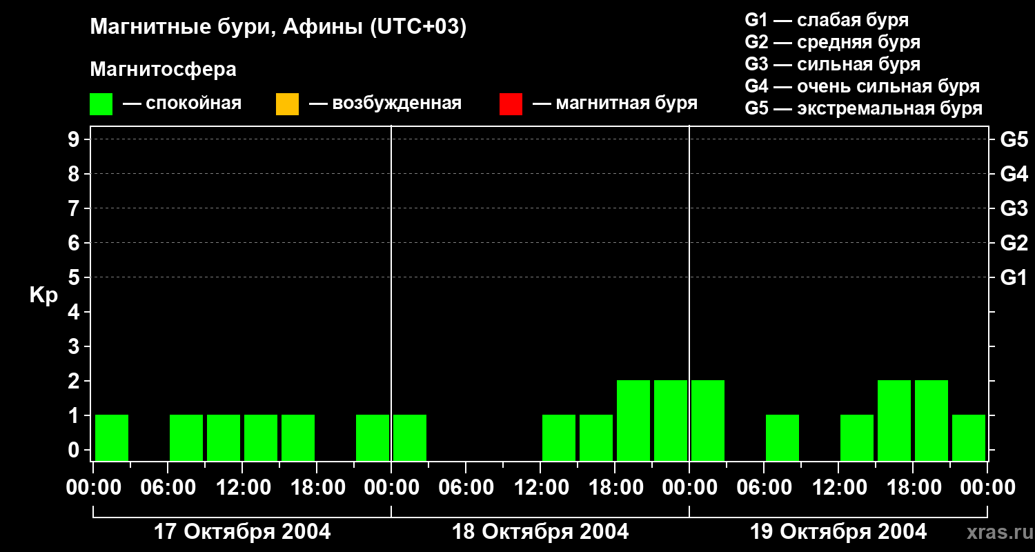 Изменения геомагнитного индекса Kp с 17 по 19 октября 2004 года для средних широт