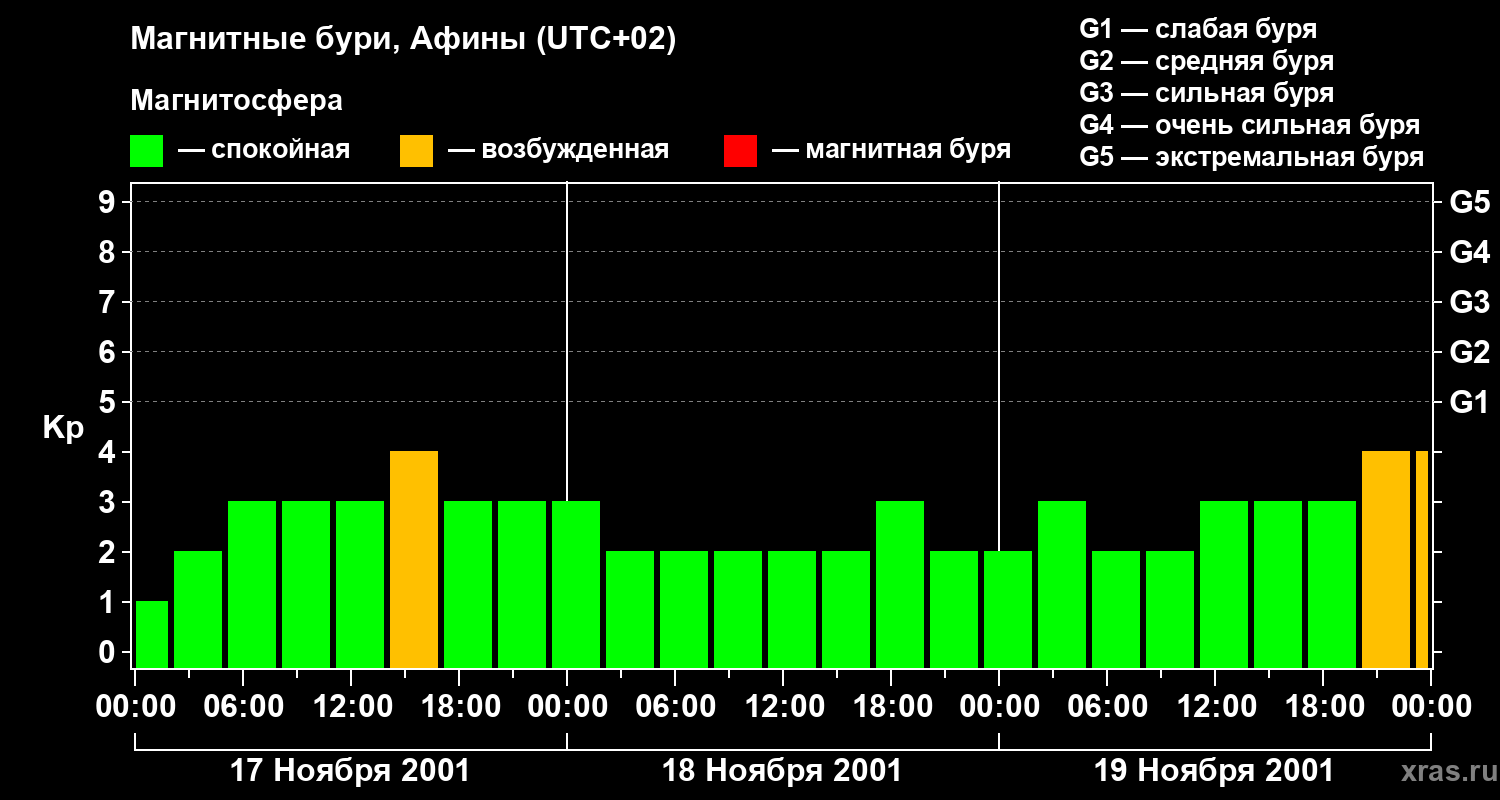 Изменения геомагнитного индекса Kp с 17 по 19 ноября 2001 года для средних широт