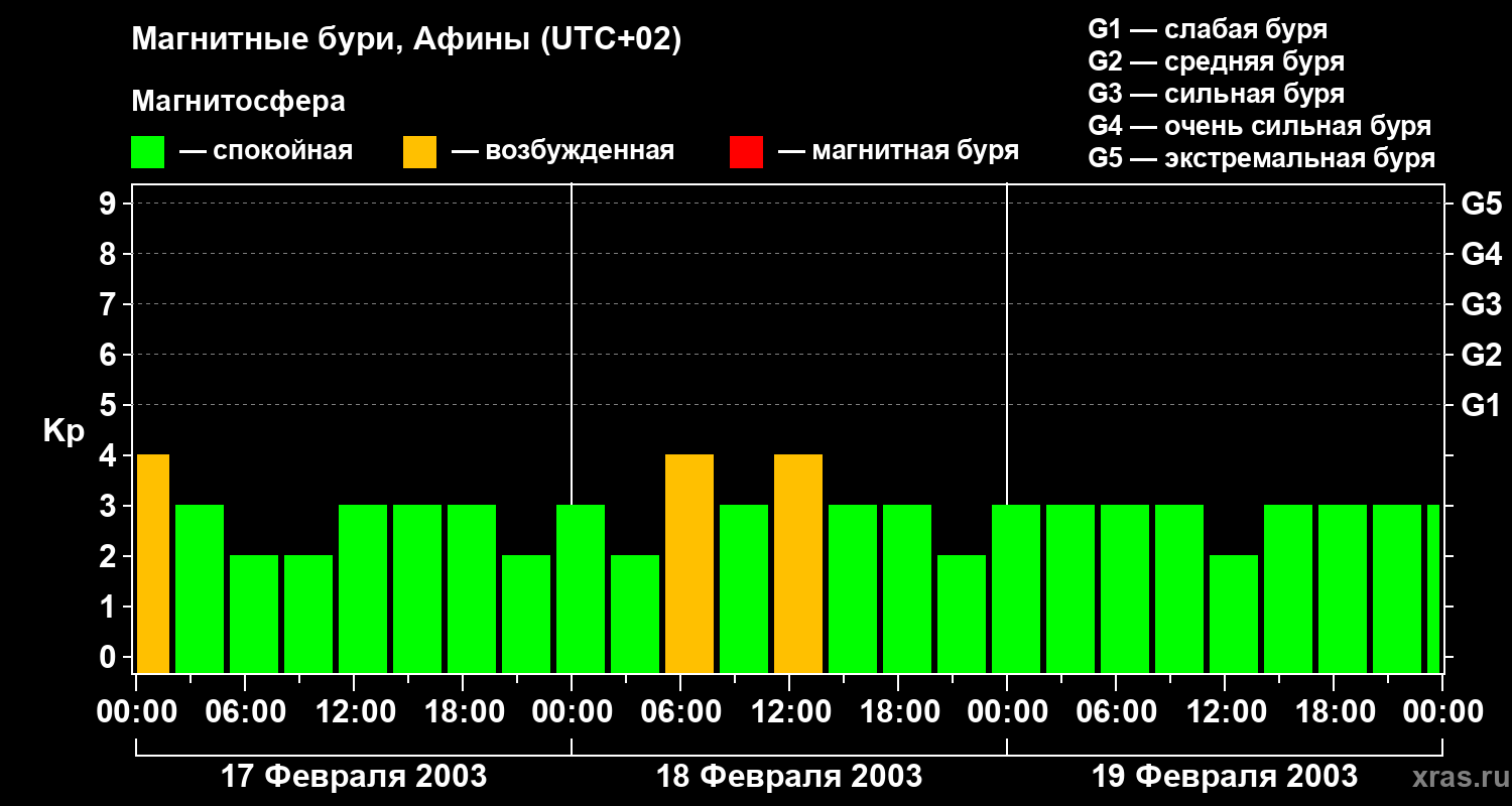 Изменения геомагнитного индекса Kp с 17 по 19 февраля 2003 года для средних широт