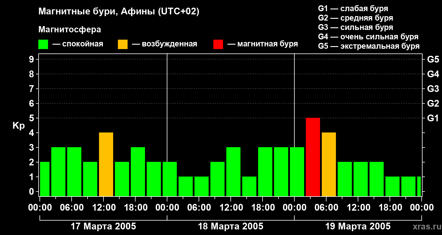Изменения геомагнитного индекса Kp с 17 по 19 марта 2005 года для средних широт