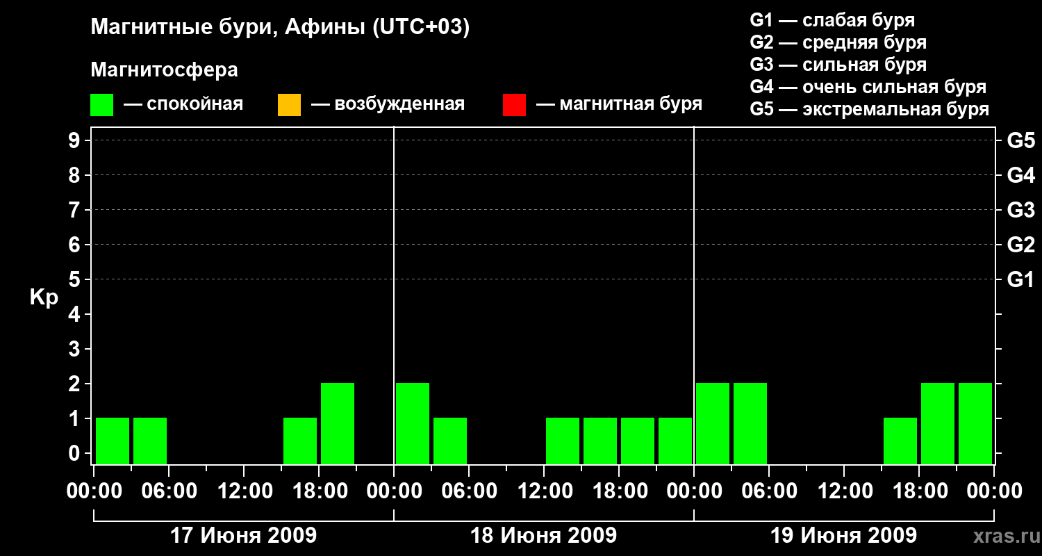Изменения геомагнитного индекса Kp с 17 по 19 июня 2009 года для средних широт