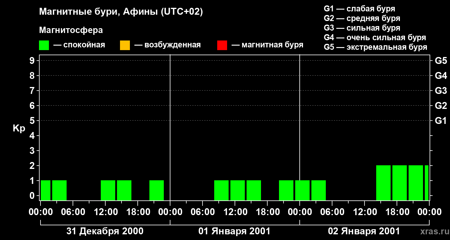 Изменения геомагнитного индекса Kp с 31 декабря 2000 года по 2 января 2001 года для средних широт