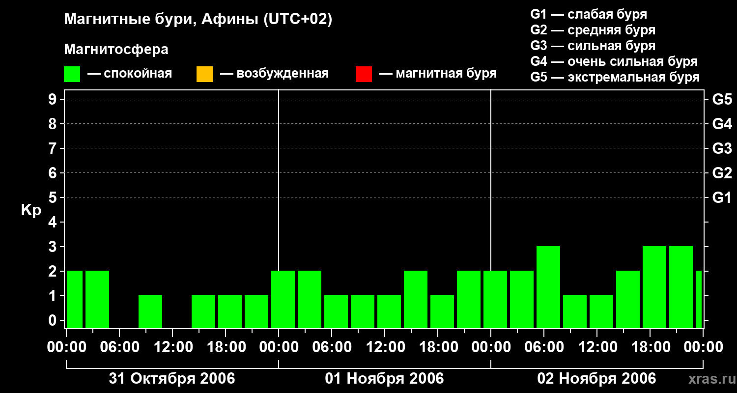 Изменения геомагнитного индекса Kp с 31 октября по 2 ноября 2006 года для средних широт