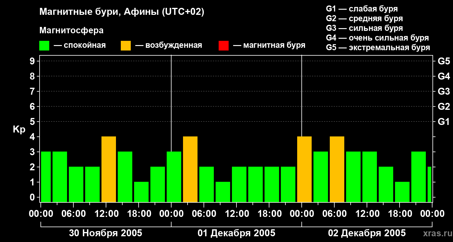 Изменения геомагнитного индекса Kp с 30 ноября по 2 декабря 2005 года для средних широт