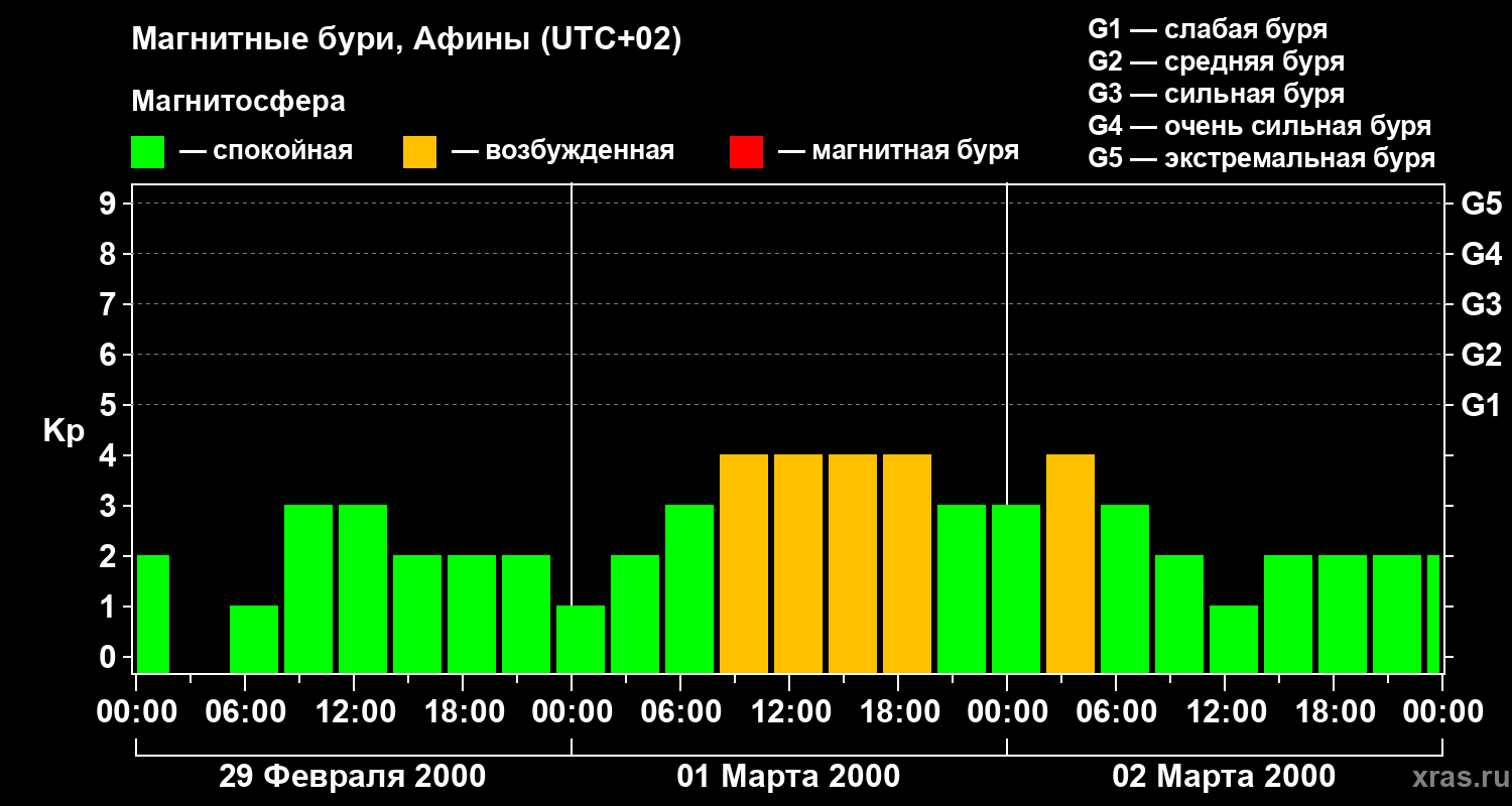 Изменения геомагнитного индекса Kp с 29 февраля по 2 марта 2000 года для средних широт