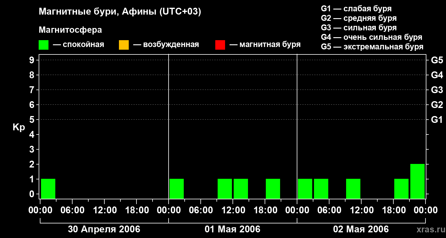 Изменения геомагнитного индекса Kp с 30 апреля по 2 мая 2006 года для средних широт