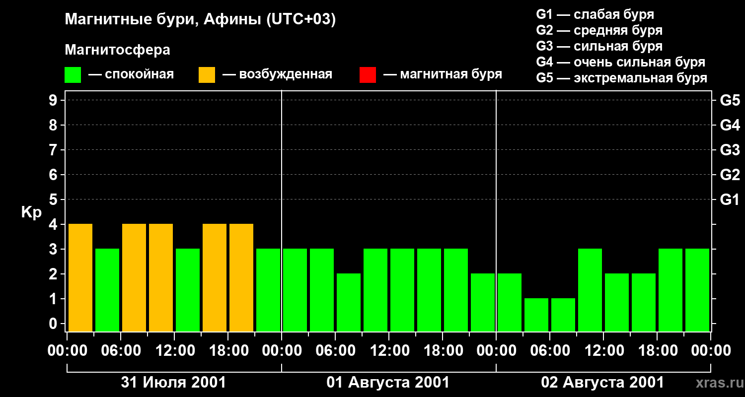 Изменения геомагнитного индекса Kp с 31 июля по 2 августа 2001 года для средних широт