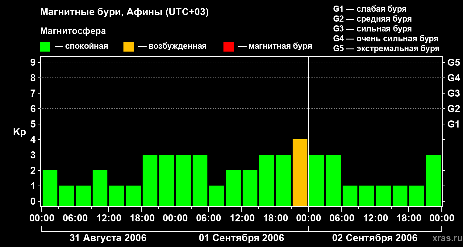 Изменения геомагнитного индекса Kp с 31 августа по 2 сентября 2006 года для средних широт