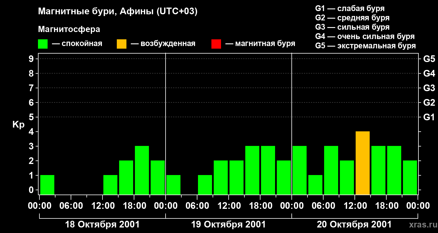 Изменения геомагнитного индекса Kp с 18 по 20 октября 2001 года для средних широт