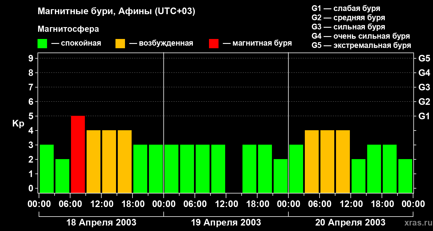 Изменения геомагнитного индекса Kp с 18 по 20 апреля 2003 года для средних широт