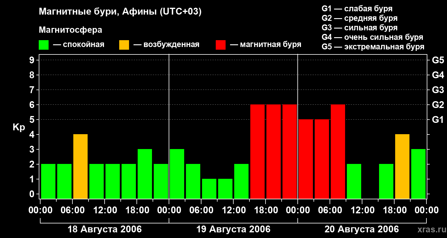 Изменения геомагнитного индекса Kp с 18 по 20 августа 2006 года для средних широт