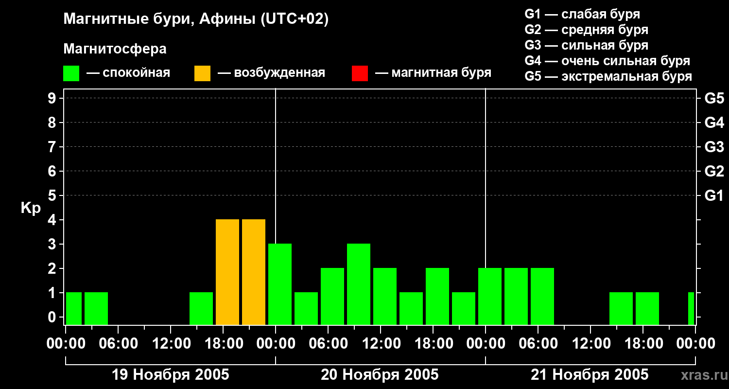 Изменения геомагнитного индекса Kp с 19 по 21 ноября 2005 года для средних широт
