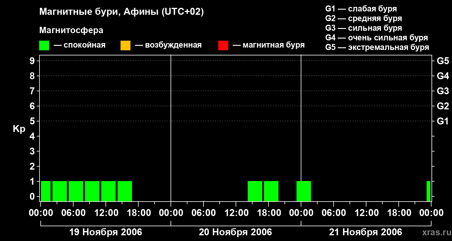 Изменения геомагнитного индекса Kp с 19 по 21 ноября 2006 года для средних широт