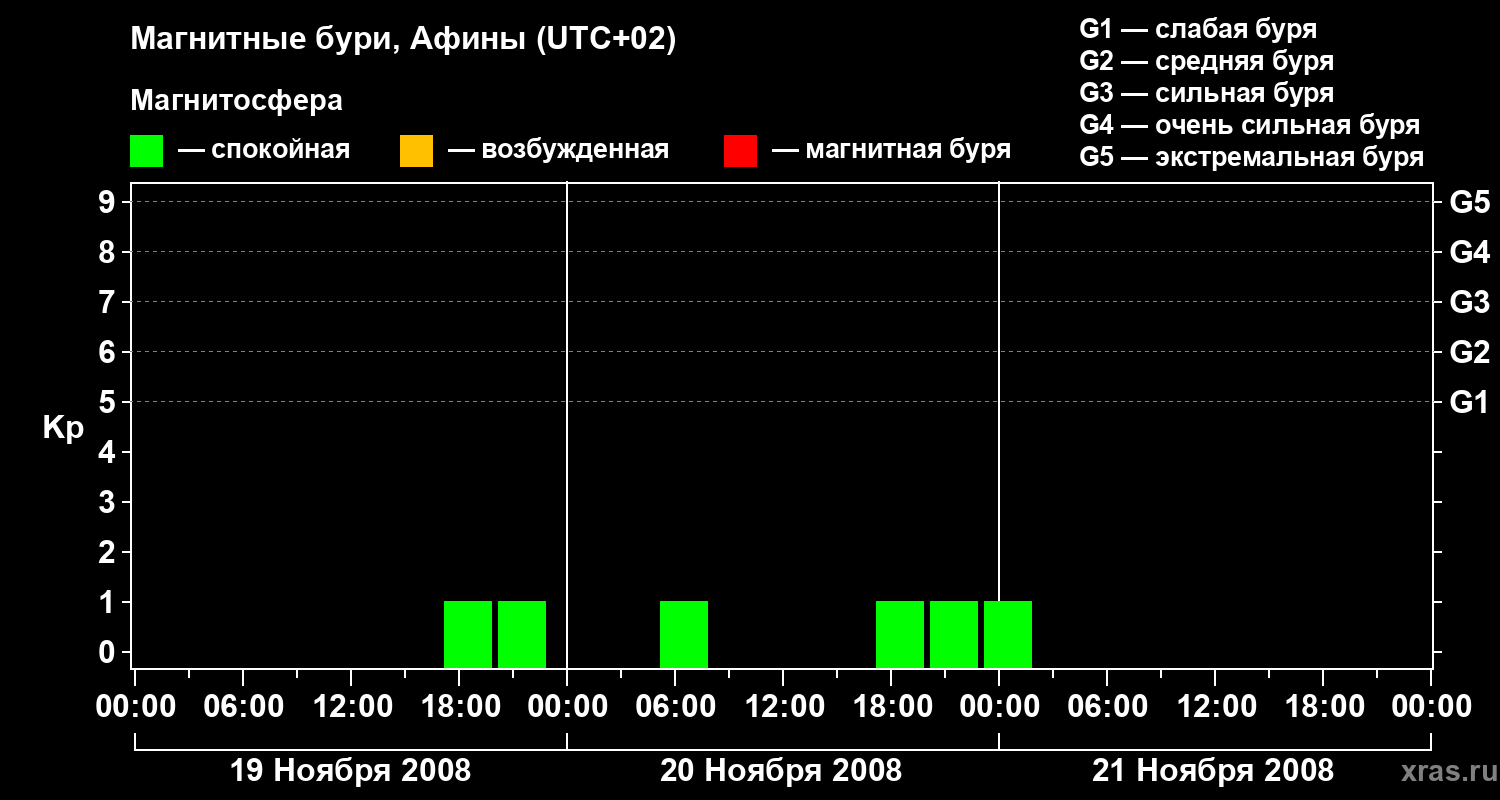 Изменения геомагнитного индекса Kp с 19 по 21 ноября 2008 года для средних широт