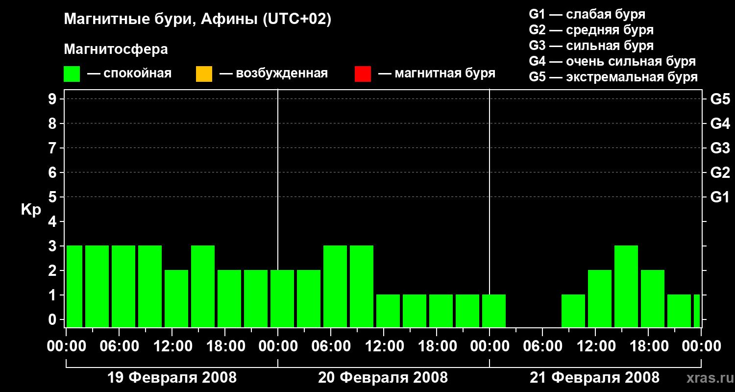Изменения геомагнитного индекса Kp с 19 по 21 февраля 2008 года для средних широт