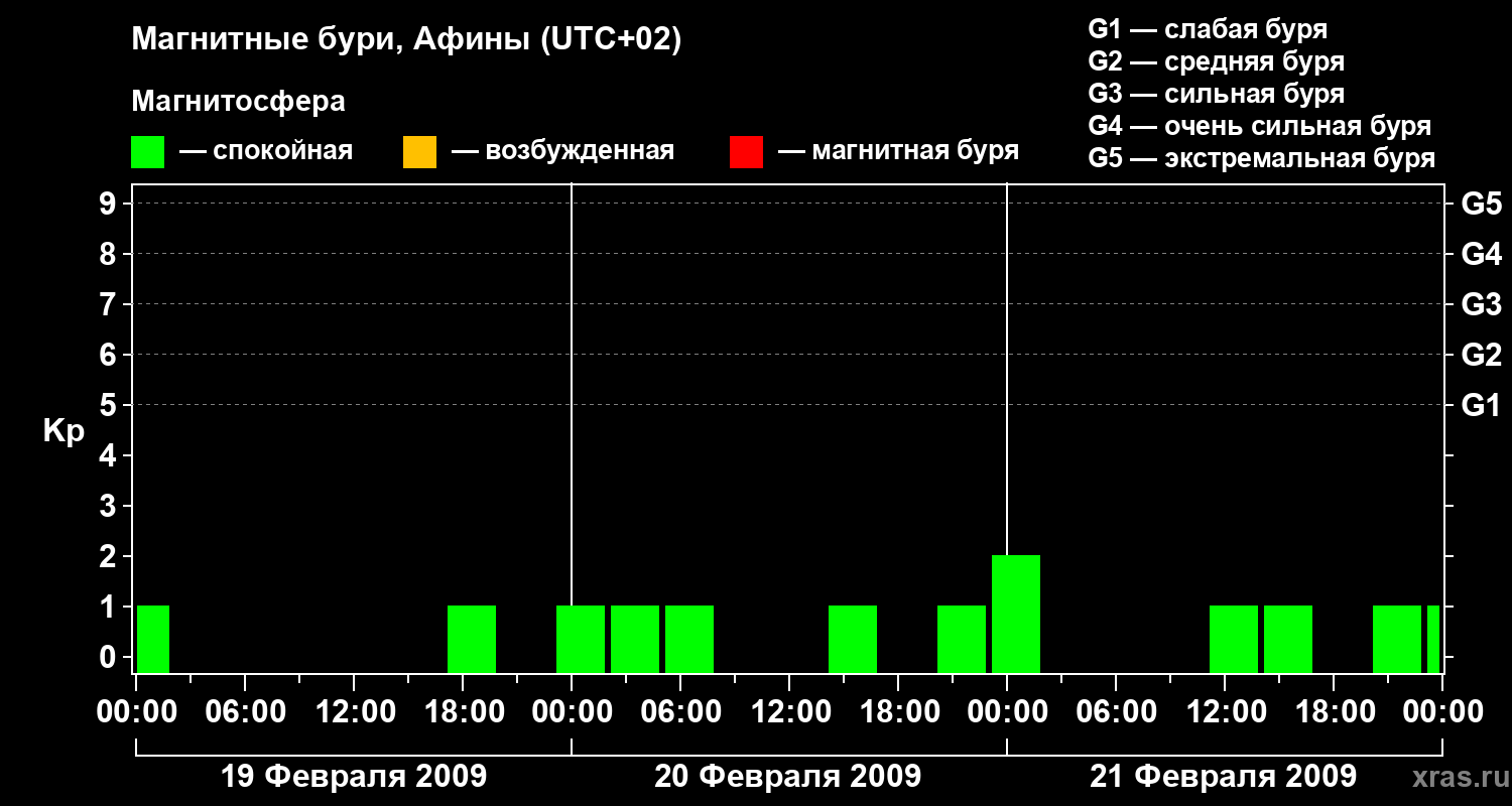 Изменения геомагнитного индекса Kp с 19 по 21 февраля 2009 года для средних широт
