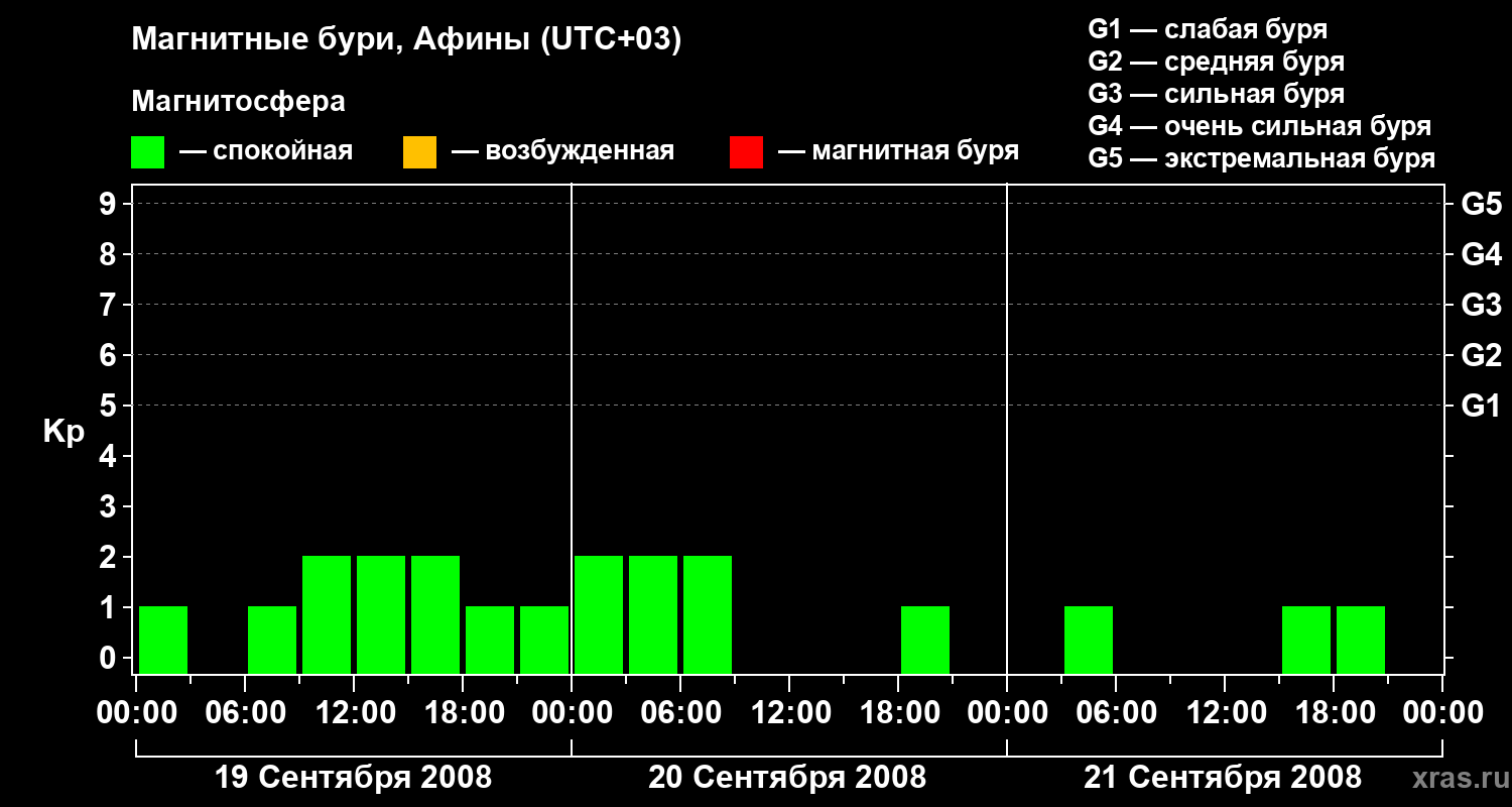 Изменения геомагнитного индекса Kp с 19 по 21 сентября 2008 года для средних широт