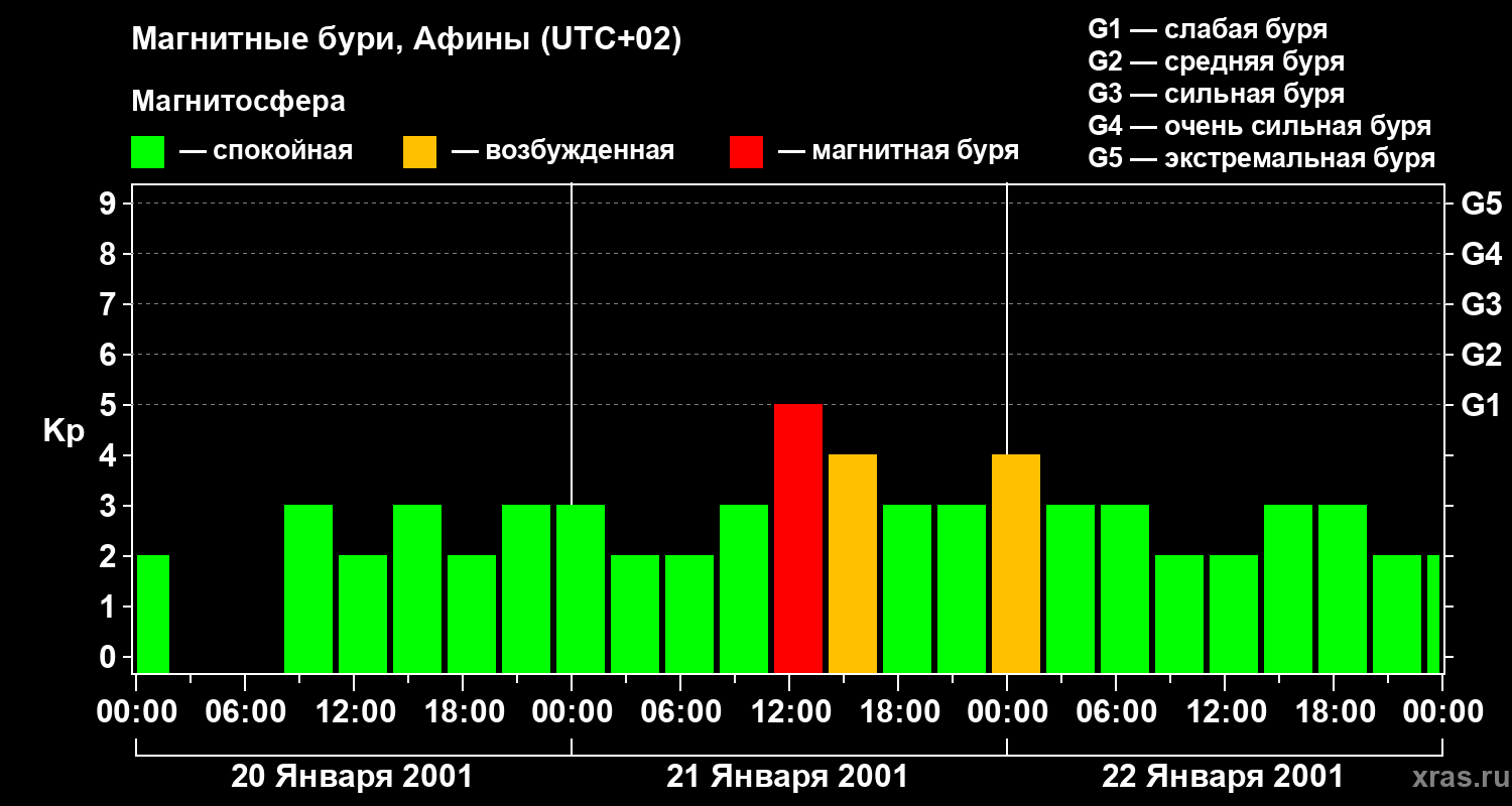 Изменения геомагнитного индекса Kp с 20 по 22 января 2001 года для средних широт