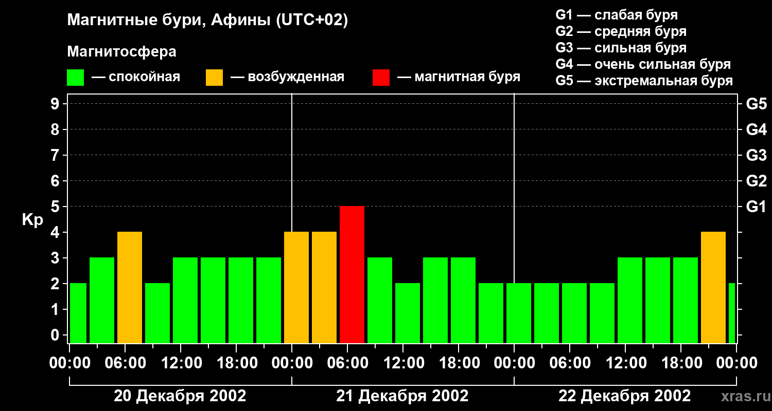 Изменения геомагнитного индекса Kp с 20 по 22 декабря 2002 года для средних широт