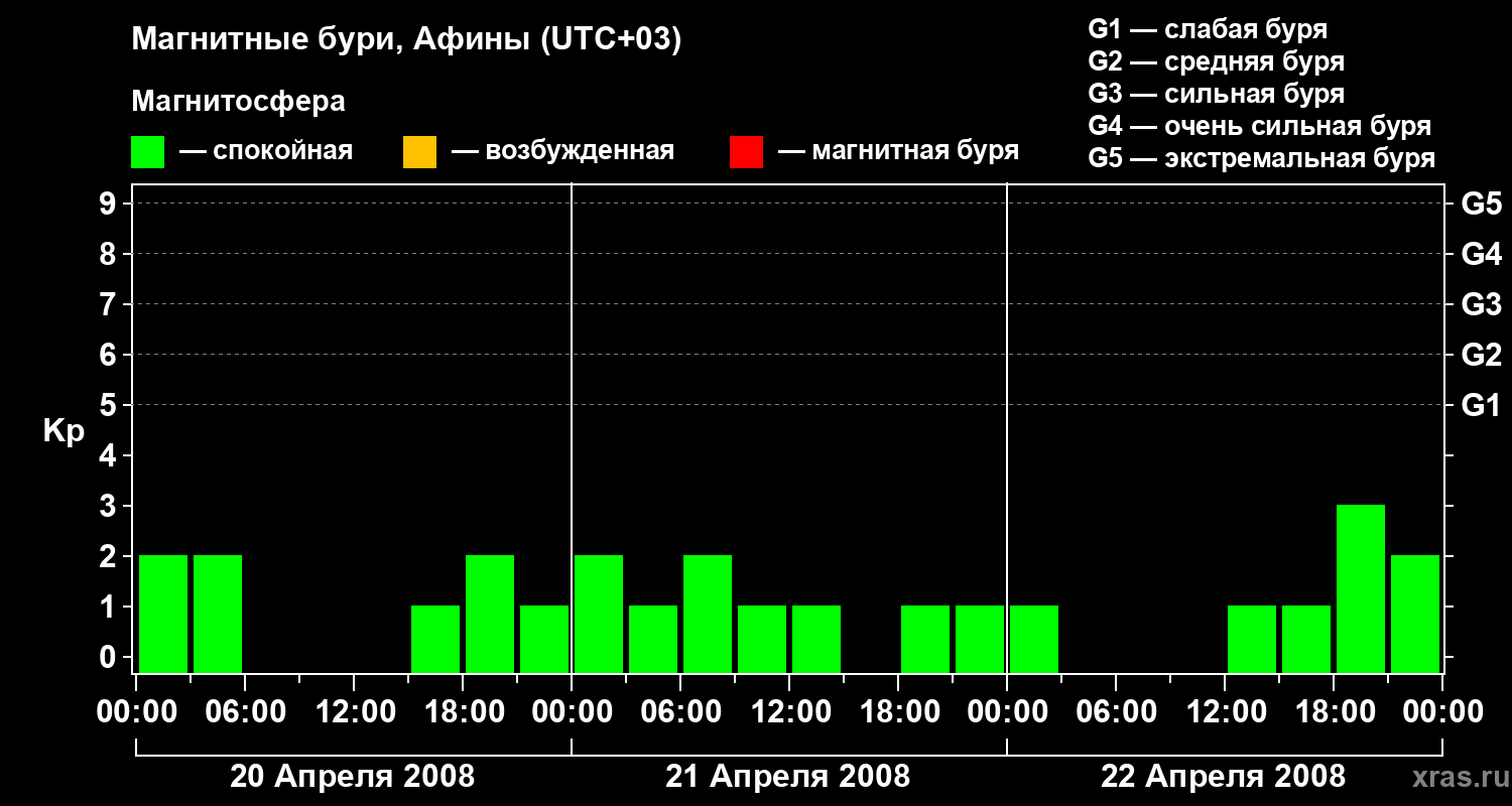 Изменения геомагнитного индекса Kp с 20 по 22 апреля 2008 года для средних широт