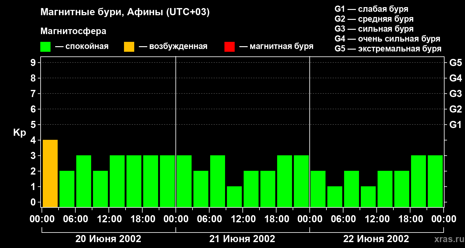 Изменения геомагнитного индекса Kp с 20 по 22 июня 2002 года для средних широт
